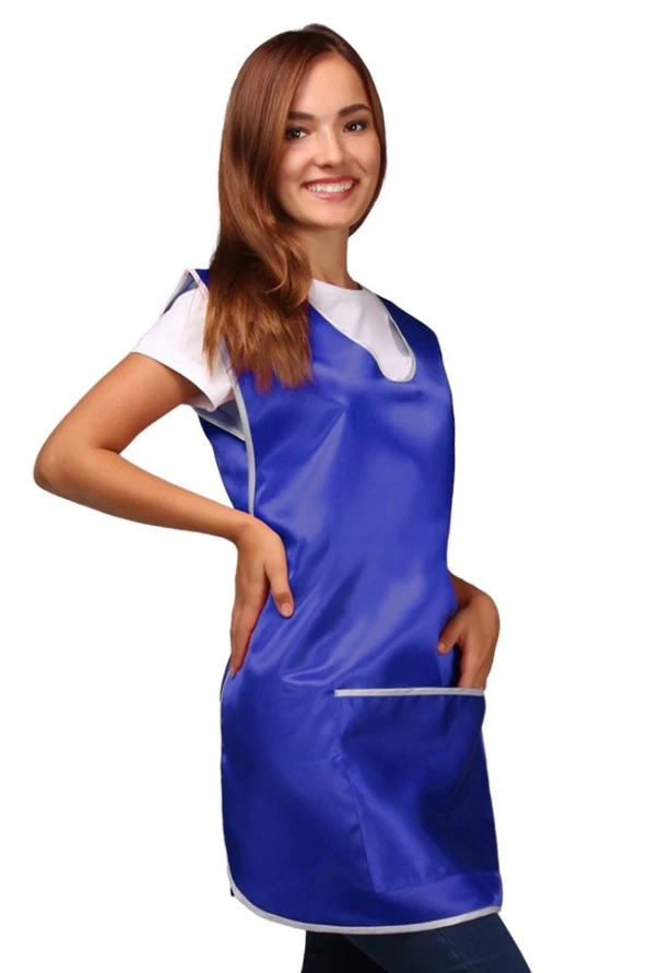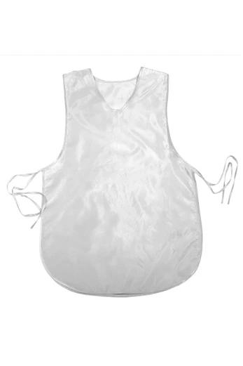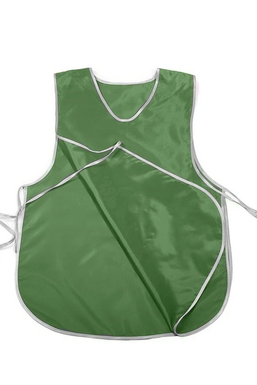 Модель: Накидка фигурной формы без карманов. За дополнительную плату фартук-накидка может быть пошит с одним карманом 20х25 см, либо двумя карманами 13х16 см. Края и горловина фартука обрабатываются косой бейкой стандартных цветов. Завязки длиной 50 см, выполнены из косой бейки.