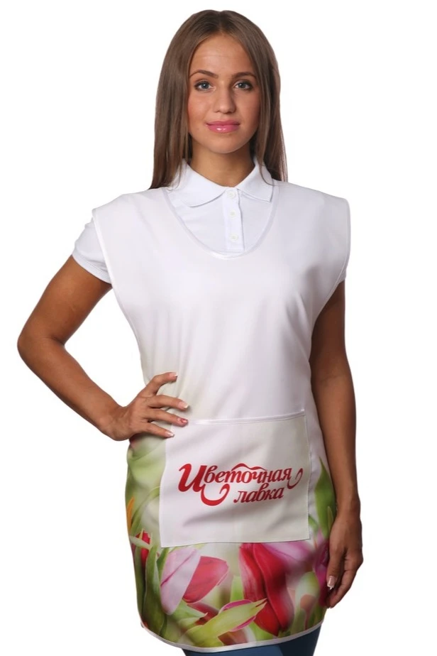 Модель: Накидка фигурной формы без карманов. За дополнительную плату фартук-накидка может быть пошит с одним карманом 20х25 см, либо двумя карманами 13х16 см. Края и горловина фартука обрабатываются косой бейкой стандартных цветов. Завязки длиной 50 см, выполнены из косой бейки.