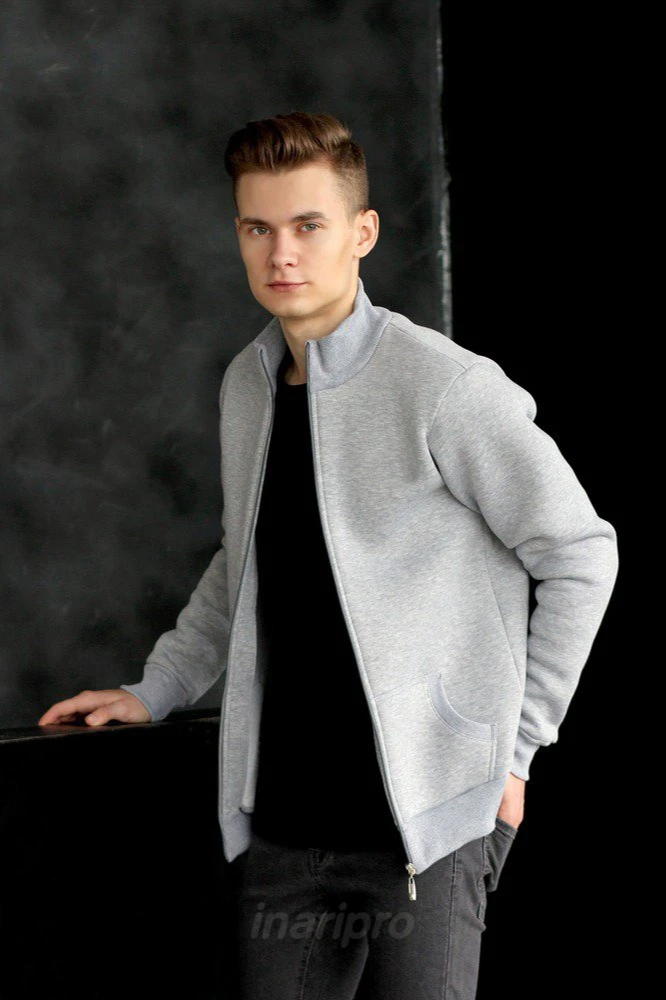 Модель. Прямой силуэт. Толстовка на молнии. Длинные рукава. Низ толстовки и рукавов, а также горловина обработаны тканью кашкорсе (специальная тканая резинка) в цвет толстовки. Толстовка без капюшона. Два раздельных кармана по типу кенгуру.