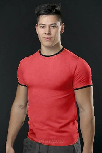 Модель. Прямой силуэт. Рукав короткий. К нижней части рукава пришивается декоративная вставка в цвет футболки или вставка стандартных цветов. Футболка имеет боковые швы без разрезов по низу изделия. Обработка горловины руликом (кантом) из основной ткани в цвет футболки или других стандартных цветов. Форма ворота О-образная.