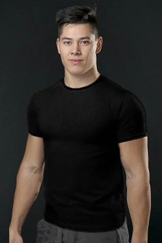 Модель. Прямой силуэт. Рукав короткий. К нижней части рукава пришивается декоративная вставка в цвет футболки или вставка стандартных цветов. Футболка имеет боковые швы без разрезов по низу изделия. Обработка горловины руликом (кантом) из основной ткани в цвет футболки или других стандартных цветов. Форма ворота О-образная.