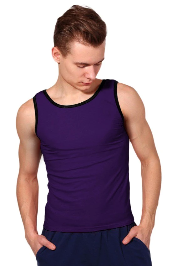 Модель. Майка с прямым силуэтом. Пройма рукавов и горловины обработаны руликом (кант из основной ткани) в цвет майки или отличным от майки цветом. Майка имеет боковые швы без разрезов по низу изделия. Форма ворота О или V-образная.