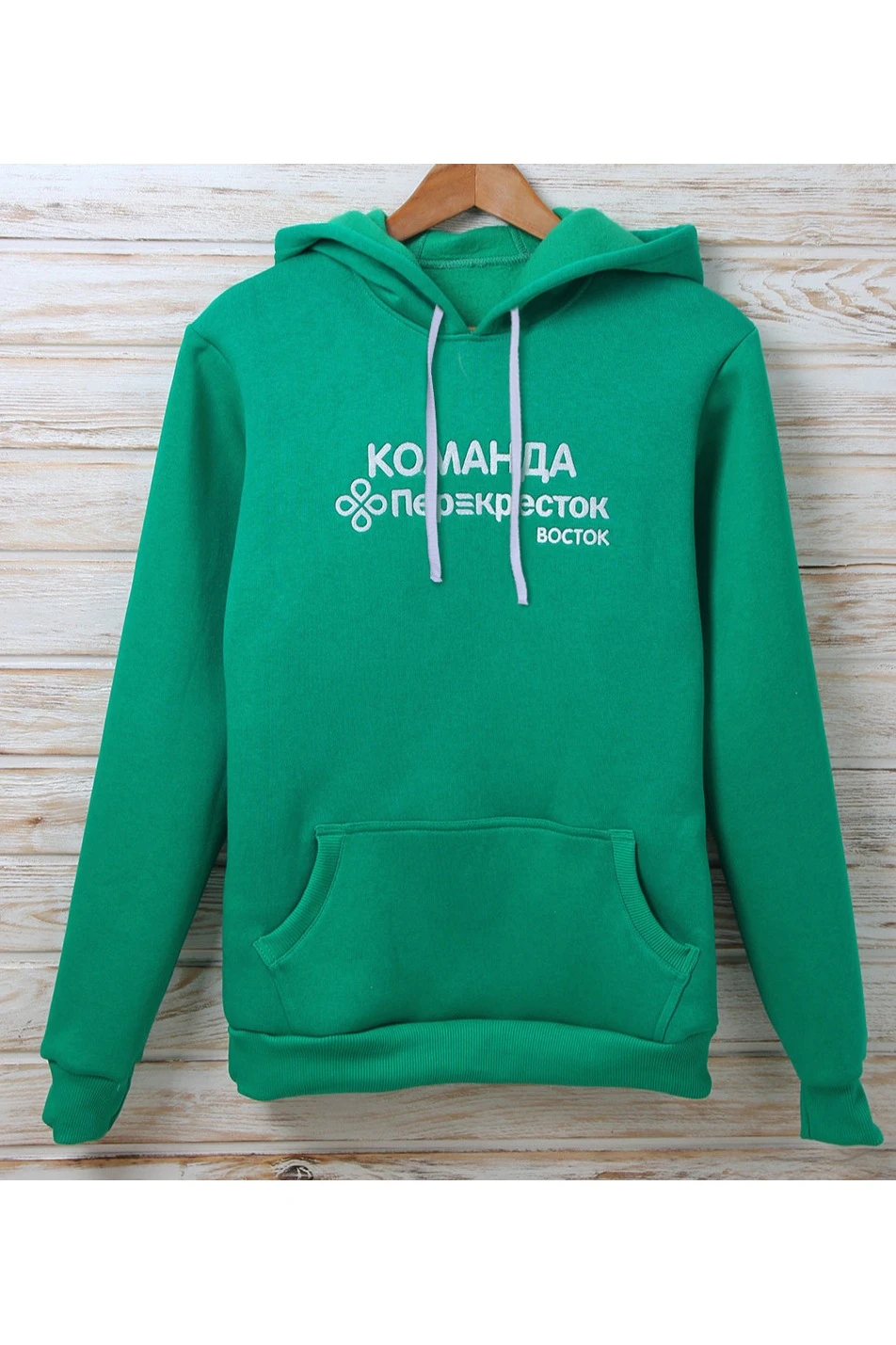 Модель. Прямой силуэт. Толстовка без молнии. Длинные рукава. Низ толстовки и рукавов обработаны тканью кашкорсе (специальная тканая резинка) в цвет толстовки. Один общий карман по типу кенгуру. Капюшон пришивной двухслойный, внутренний слой из однотонной кулирной глади с лайкрой стандартных цветов на выбор. У края капюшона продет плоский шнур шириной 15 мм стандартных цветов.