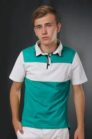 Модель. Прямой силуэт, за счет ткани стрейч облегает фигуру. Рукав короткий. Боковые разрезы по низу изделия. Планка на три пуговицы, воротник стойка из основной ткани. Применяются стандартные цвета пуговиц. На полочке футболки декоративная вставка, за счет чего есть возможность комбинировать цвета на усмотрение клиента. Край воротника и планки окантован контрастным цветом.