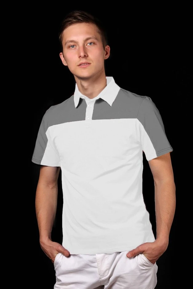 Модель. Прямой силуэт за счет ткани стрейч облегает фигуру. Рукав короткий. Боковые разрезы по низу изделия. Планка на три пуговицы, воротник стойка из основной ткани. Применяются стандартные цвета пуговиц. Футболка состоит из двух сшивных деталей на полочке, спинке и рукавах, за счет чего есть возможность комбинировать цвета на усмотрение клиента.