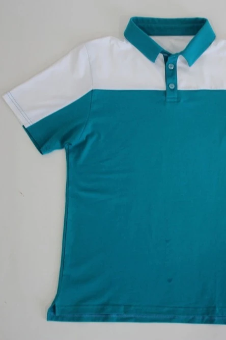 Модель. Прямой силуэт за счет ткани стрейч облегает фигуру. Рукав короткий. Боковые разрезы по низу изделия. Планка на три пуговицы, воротник стойка из основной ткани. Применяются стандартные цвета пуговиц. Футболка состоит из двух сшивных деталей на полочке, спинке и рукавах, за счет чего есть возможность комбинировать цвета на усмотрение клиента.
