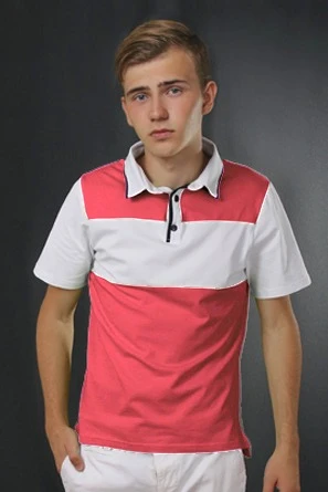Модель. Прямой силуэт, за счет ткани стрейч облегает фигуру. Рукав короткий. Боковые разрезы по низу изделия. Планка на три пуговицы, воротник стойка из основной ткани. Применяются стандартные цвета пуговиц. На полочке футболки декоративная вставка, за счет чего есть возможность комбинировать цвета на усмотрение клиента. Край воротника и планки окантован контрастным цветом.