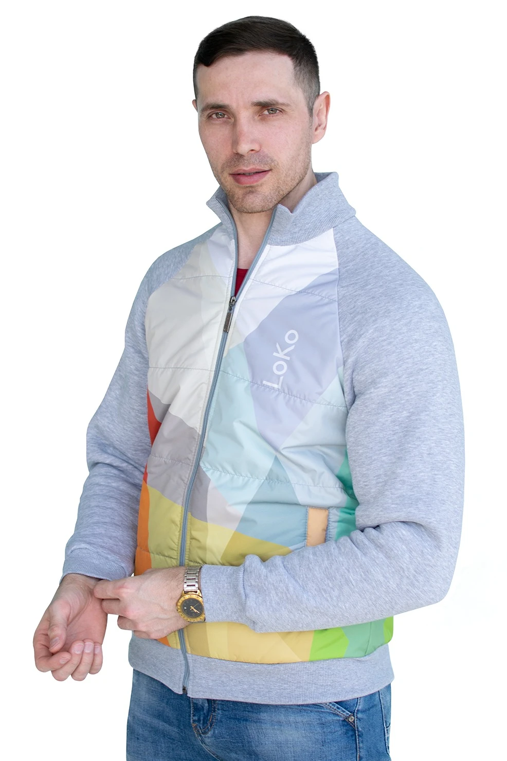 Модель. Толстовка прямого силуэта с рукавом реглан, имеет два прорезных кармана в листочку без молнии, полочка и спинка со стандартной стежкой. Без капюшона, застежка молния. Основной материал футер 3-х нитка с начесом стандартных цветов, полочка и спинка выполнены из дьюспо с полной запечаткой. Подклад из шелка расцвечивания стандартных цветов, имеет наполнитель из синтепона 60 гр.. Воротник, манжеты рукавов и низ толстовки выполнены из кашкорсе стандартных цветов.