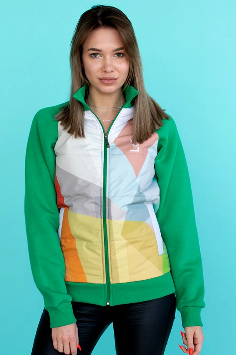 Модель. Толстовка прямого силуэта, имеет два прорезных кармана в листочку без молнии, полочка и спинка со стандартной стежкой. Без капюшона, застежка молния. Основной материал футер 3-х нитка с начесом стандартных цветов, полочка и спинка выполнены из дьюспо с полной запечаткой. Воротник, манжеты рукавов и низ толстовки выполнены из кашкорсе стандартных цветов.