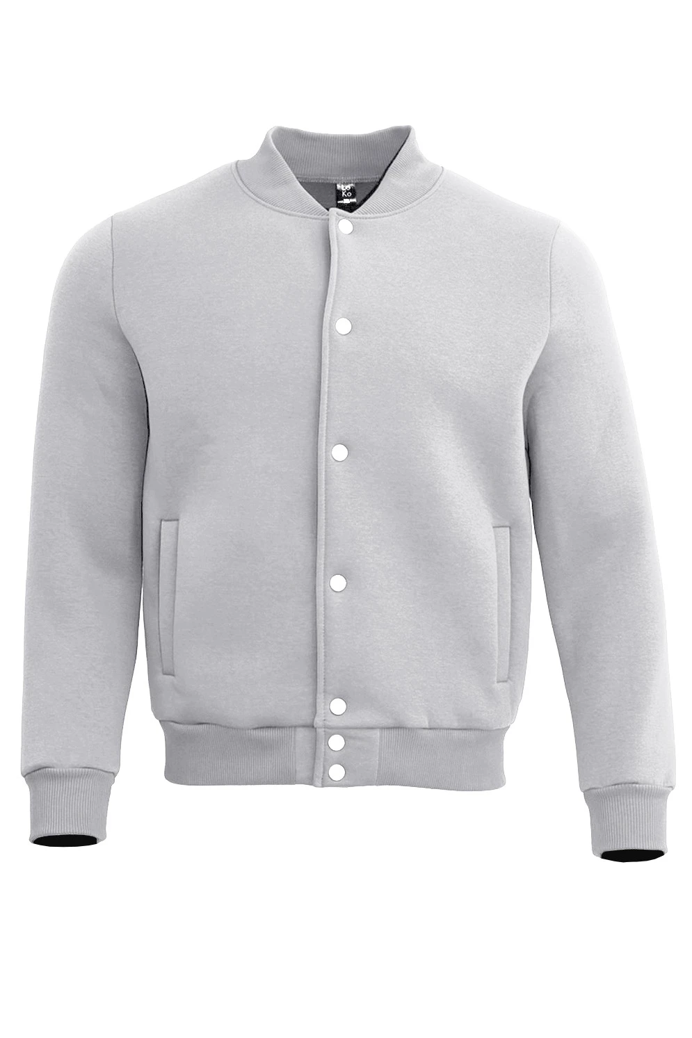 Модель. Бомбер прямого силуэта, без капюшона. Длинные рукава с манжетами из ткани футер с начесом. Низ бомбера и рукавов, а также воротник с закругленными углами выполнены из кашкорсе (специальная тканная резинка) в цвет изделия. Бомбер застегивается на семь кнопок. Имеет два боковых кармана в листочку без молнии.