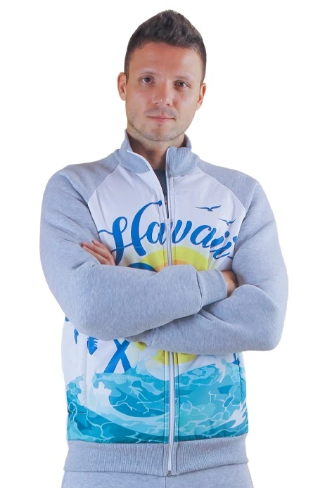 Модель. Толстовка прямого силуэта, имеет два прорезных кармана в листочку без молнии, полочка и спинка со стандартной стежкой. Без капюшона, застежка молния. Основной материал футер 3-х нитка с начесом стандартных цветов, полочка и спинка выполнены из дьюспо с полной запечаткой. Воротник, манжеты рукавов и низ толстовки выполнены из кашкорсе стандартных цветов.