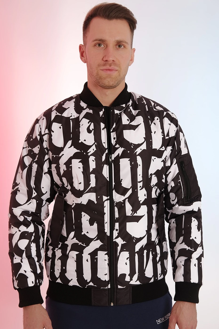 Модель. Куртка-бомбер прямого силуэта без капюшона, с утеплителем из синтепона, в качестве подклада дешайн с полной запечаткой. Застегивается на металлическую молнию. Имеет два накладных кармана на кнопках и один накладной карман на рукаве с молнией. Воротник, манжеты рукавов и низ куртки-бомбера выполнены из кашкорсе стандартных цветов.