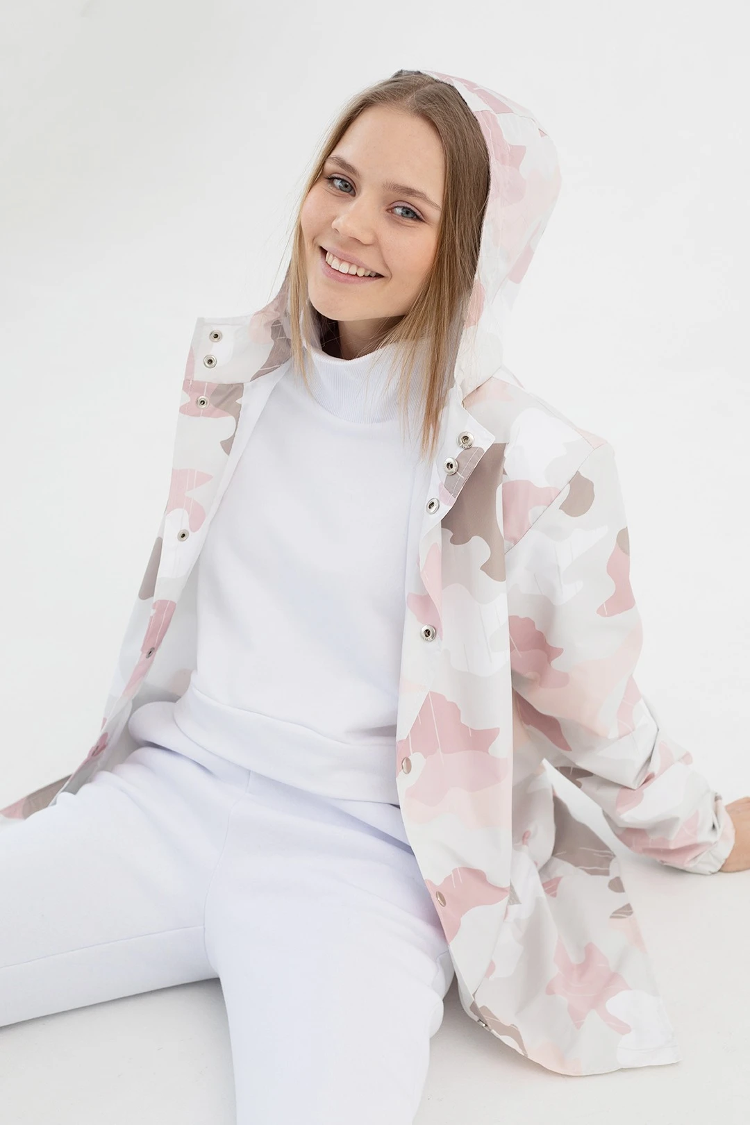 Модель. Дождевик прямого силуэта с длинным рукавом с манжетой на резинке. Пришивной капюшон затягивается резинкой с фиксаторами. Задняя часть удлинённая с фигурным низом. Дождевик застегивается на кнопки (9 шт). Дождевик с подкладом из шелка расцвечивания стандартных цветов. Имеет два кармана с клапаном на кнопках.