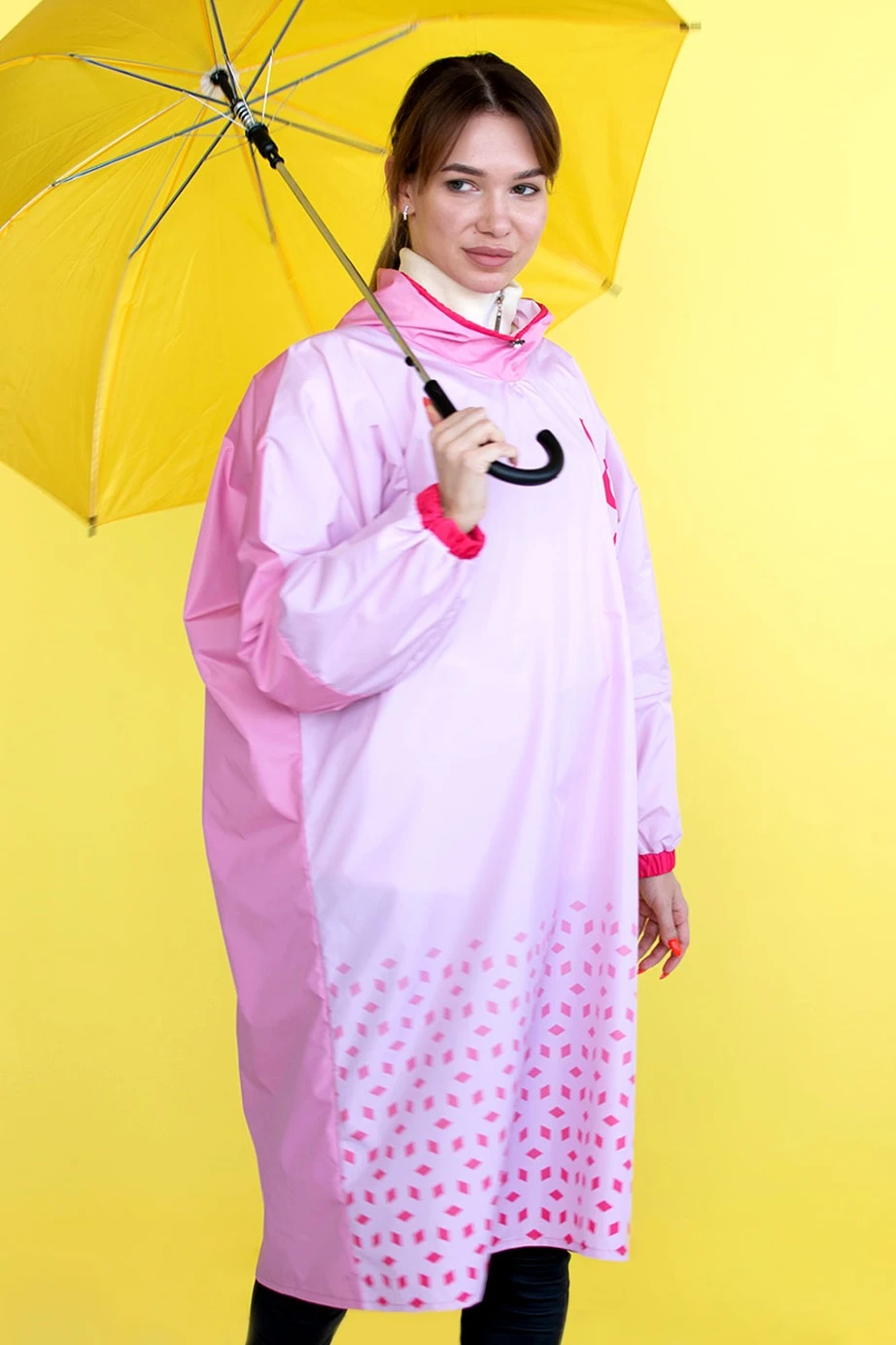Модель. Дождевик прямого силуэта с длинным рукавом и манжетой на резинке. Пришивной капюшон затягивается шнуром с фиксаторами. Дождевик без застежки и карманов.