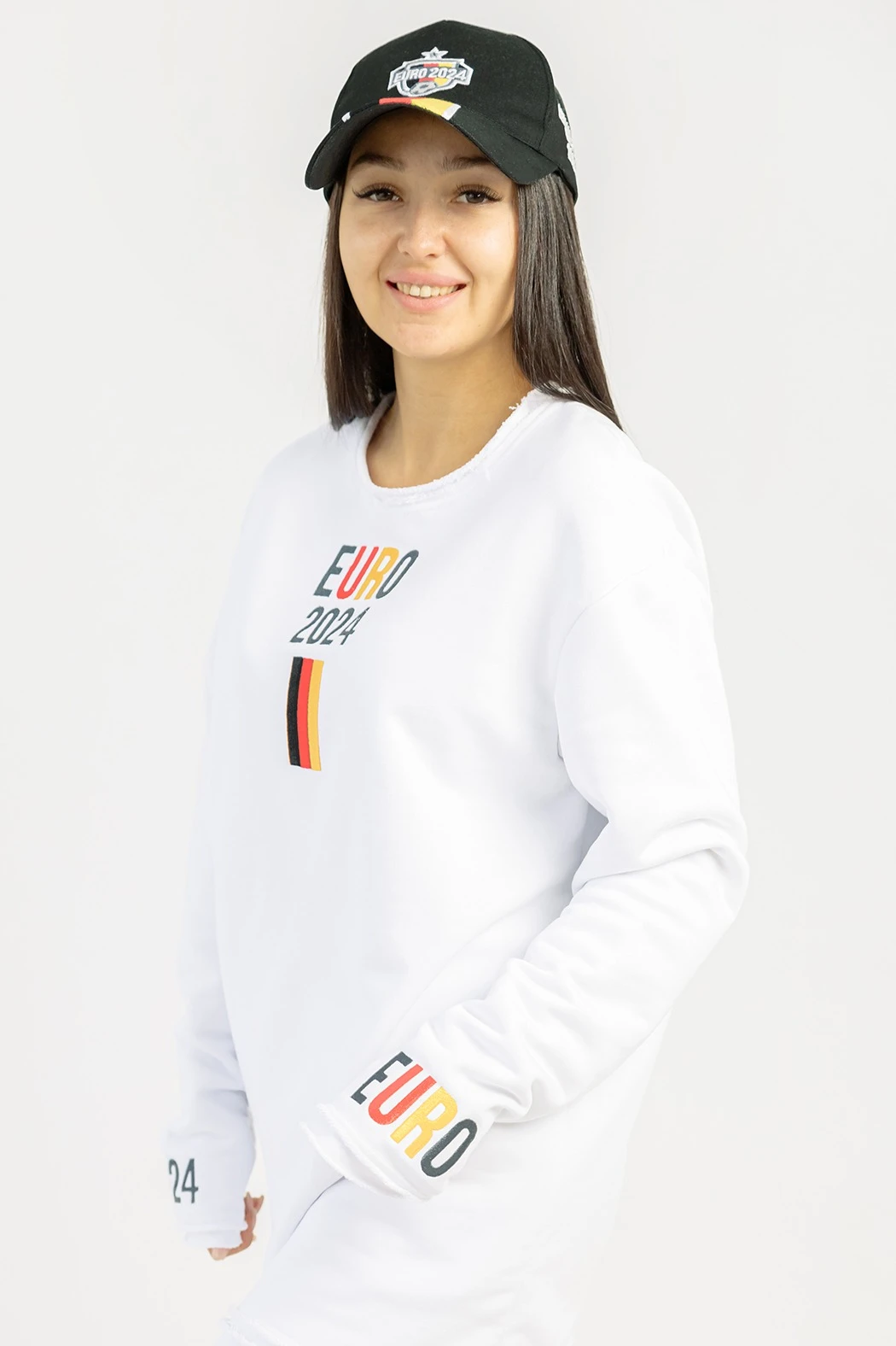 Модель. Толстовка прямого силуэта, без молнии с длинными рукавами и опущенной линией плеч. Низ толстовки и рукавов, а также горловина с имитацией необработанного края. Толстовка без капюшона и карманов.