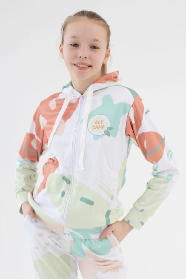 Модель. Прямой силуэт, балахон на молнии. Длинные рукава. Низ балахона и манжеты рукавов выполнены из сублимационной ткани сандвич браш. Два раздельных накладных кармана по типу кенгуру. Капюшон пришивной двухслойный, внутренний слой из однотонной кулирной глади с лайкрой стандартных цветов на выбор. Рекомендуется выбрать кулирную гладь цвета меланж, универсален под любой дизайн. У края капюшона продет плоский шнур шириной 15 мм стандартных цветов.