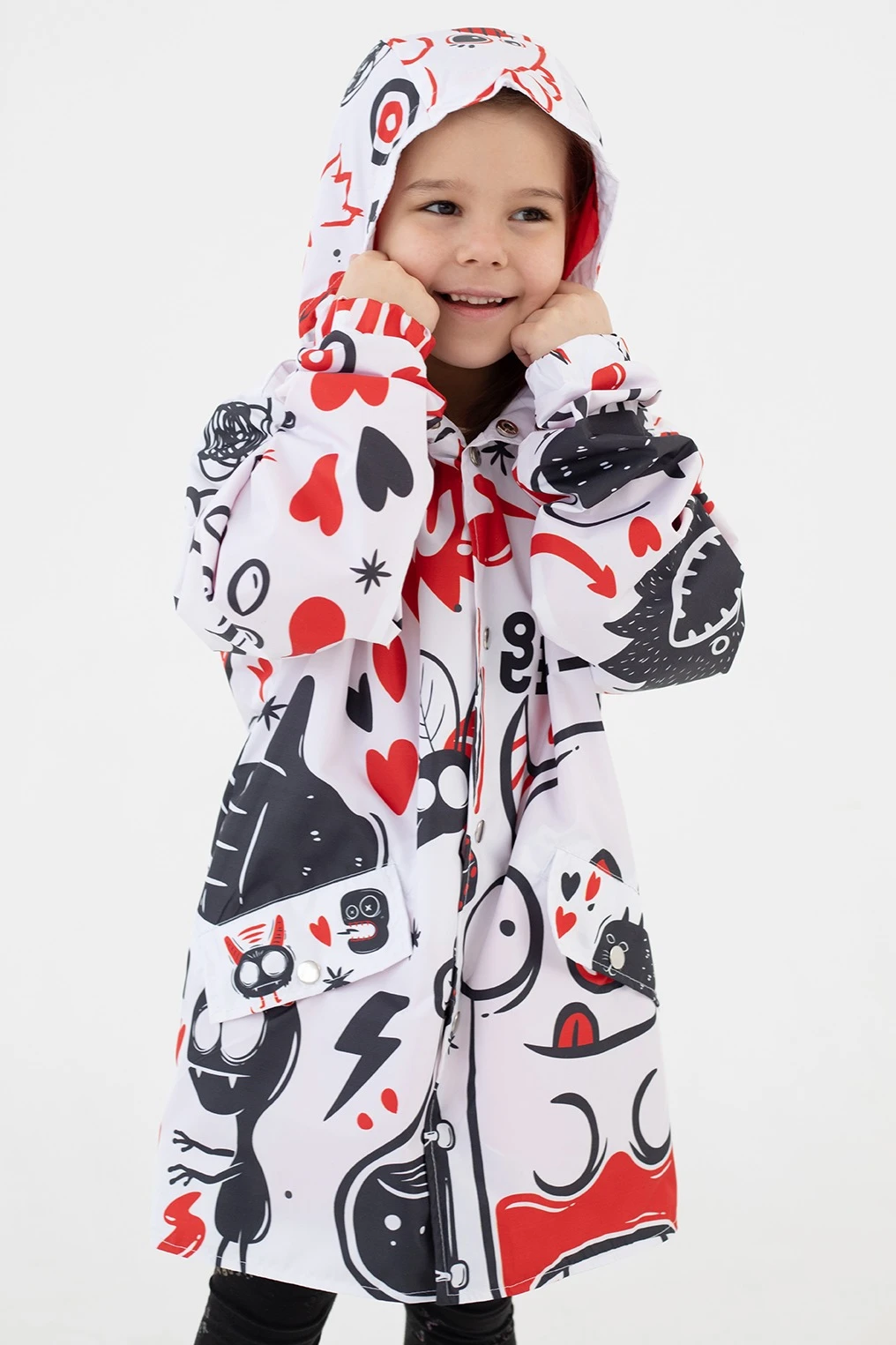 Модель. Дождевик прямого силуэта с длинным рукавом с манжетой на резинке. Пришивной капюшон затягивается резинкой с фиксаторами. Задняя часть удлинённая с фигурным низом. Дождевик застегивается на кнопки (9 шт). Дождевик с подкладом из шелка расцвечивания стандартных цветов. Имеет два кармана с клапаном на кнопках.