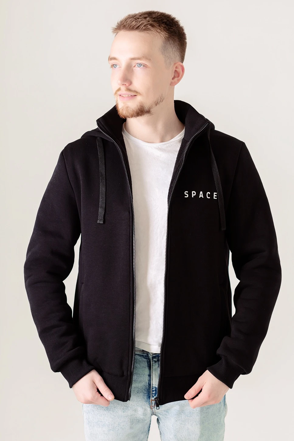 Модель. Балахон Джеймс прямого силуэта на молнии. Выполнен из двух слоев ткани. Верхний слой из футера, внутренний слой выполнен из флиса. Толстовка с длинными рукавами. По низу толстовки и рукавов прошита специальная тканная резинка кашкорсе в цвет балахона. Два прорезных кармана в листочку на молнии и два внутренних кармана на молнии. Капюшон пришивной двухслойный. У края капюшона продет плоский шнур шириной 15 мм стандартных цветов.