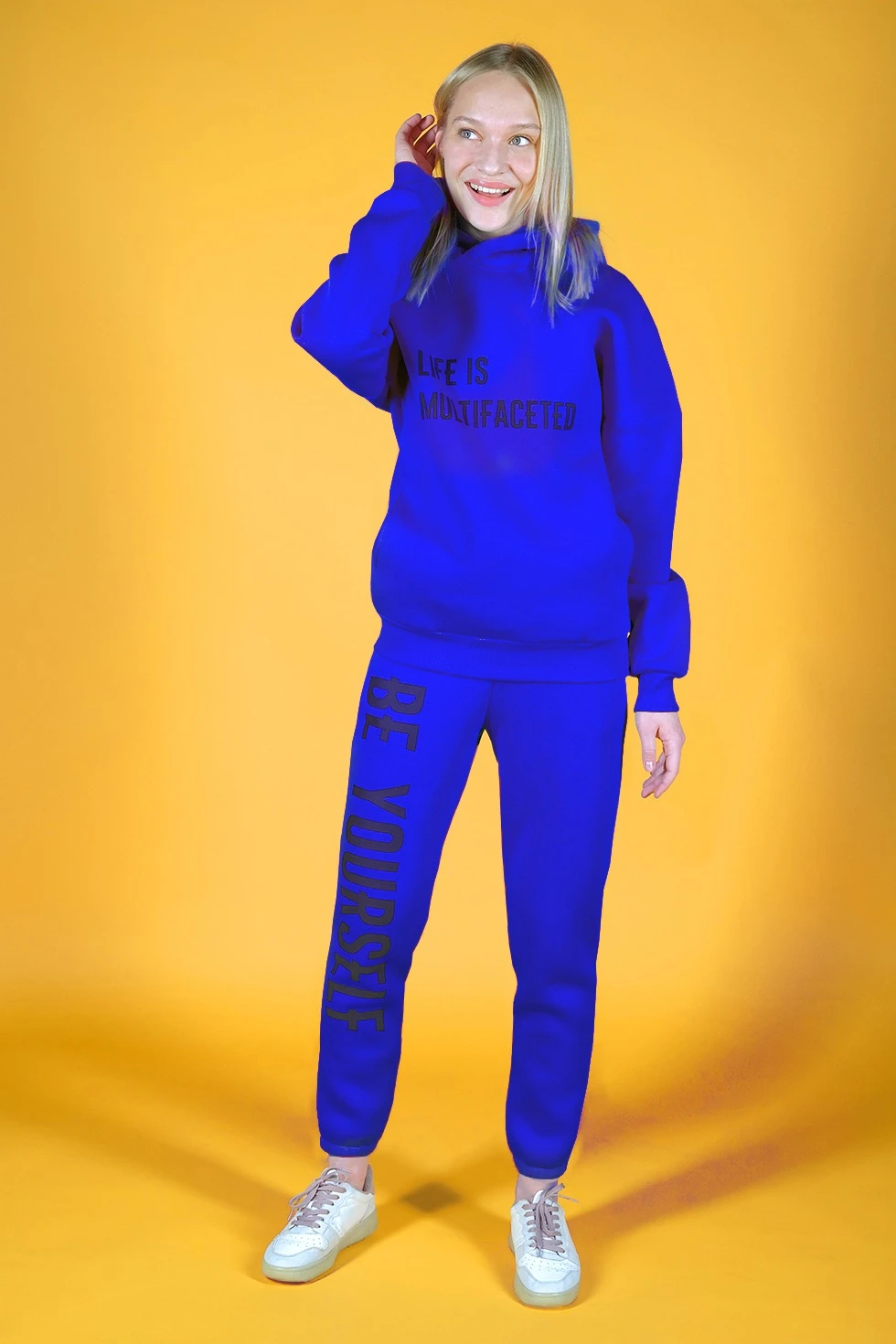 • В костюме возможно сочетать худи и брюки разных размеров.