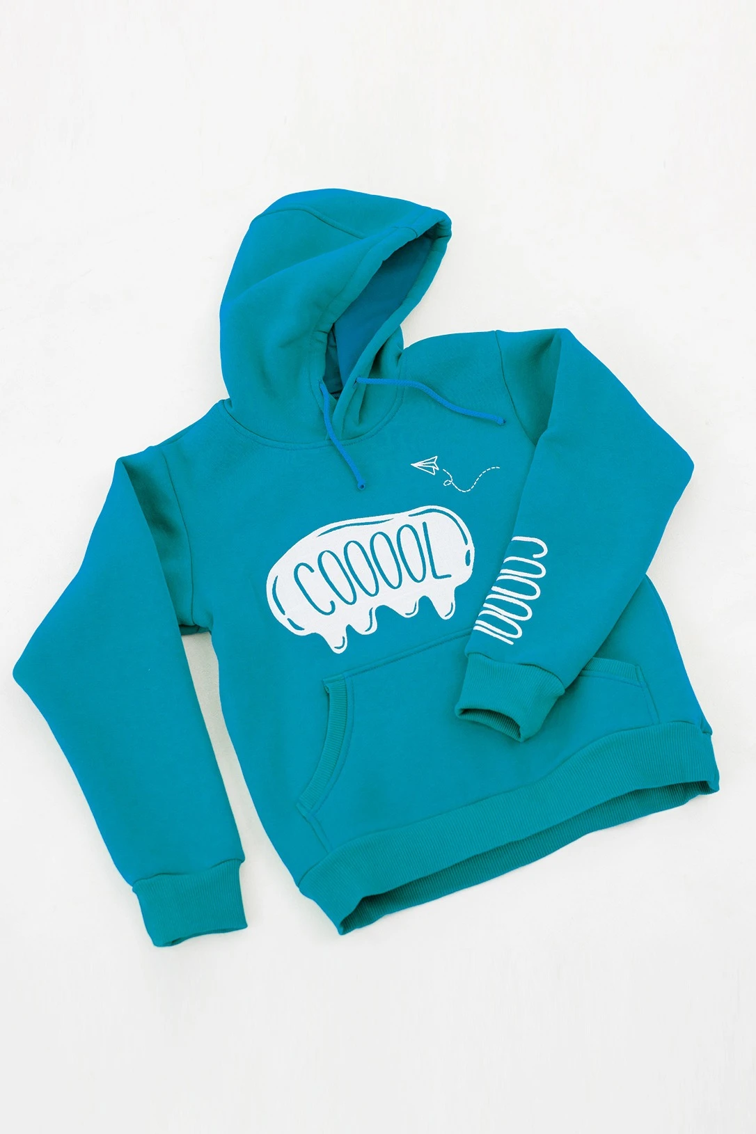 Модель. Толстовка прямого силуэта без молнии. Длинные рукава. Низ толстовки и рукавов обработаны тканью кашкорсе (специальная тканая резинка) в цвет толстовки. Один общий карман по типу кенгуру. Капюшон пришивной двухслойный, внутренний слой из однотонной кулирной глади с лайкрой стандартных цветов на выбор. У края капюшона продет плоский шнур шириной 15 мм стандартных цветов.