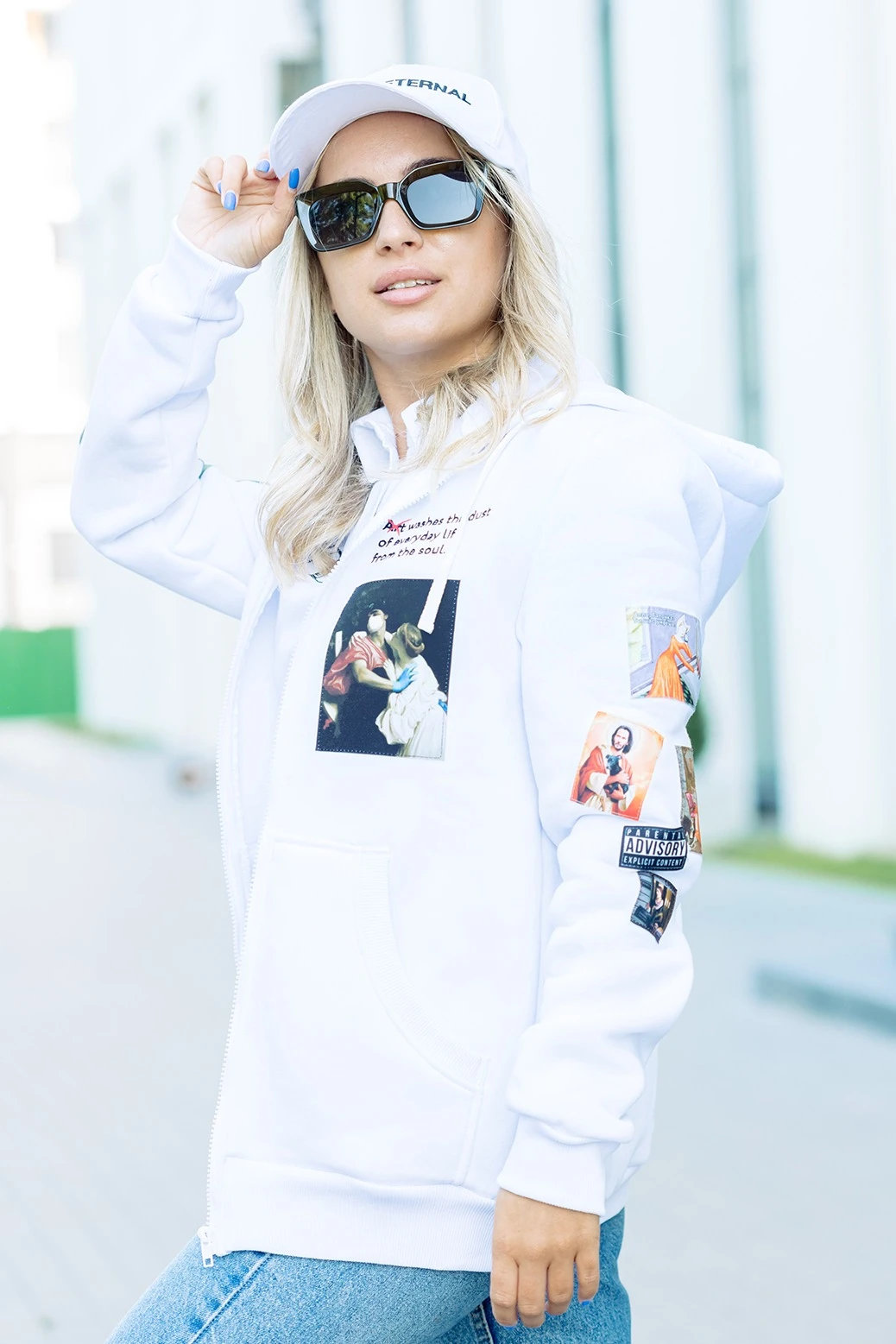 Вышивка. Изображение располагается в соответствии с лекалом. Минимальная высота буквенного написания 5 мм. Возможна вышивка на рукавах толстовки.
