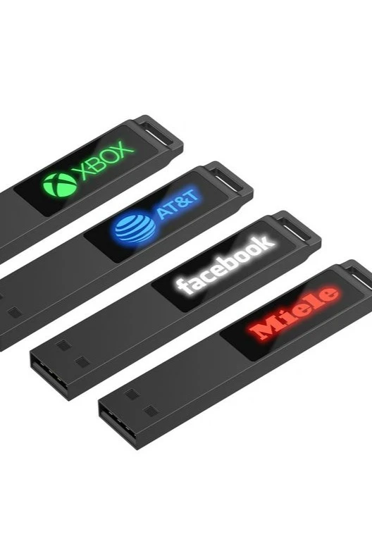 Флешка в тонком металлическом корпусе с пластиковой самоклеящимся шильдом в комплекте. Благодаря встроенной в корпус светодиодной матрице, логотип, выполненный на шильде методом лазерной гравировки, подсвечивается белым, красным, зеленым или синим в зависимости от выбранной модели.