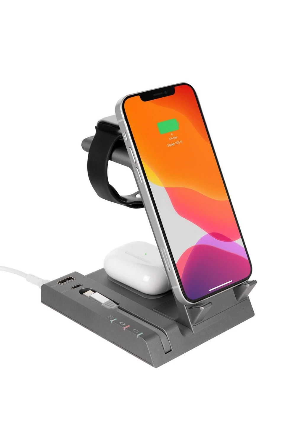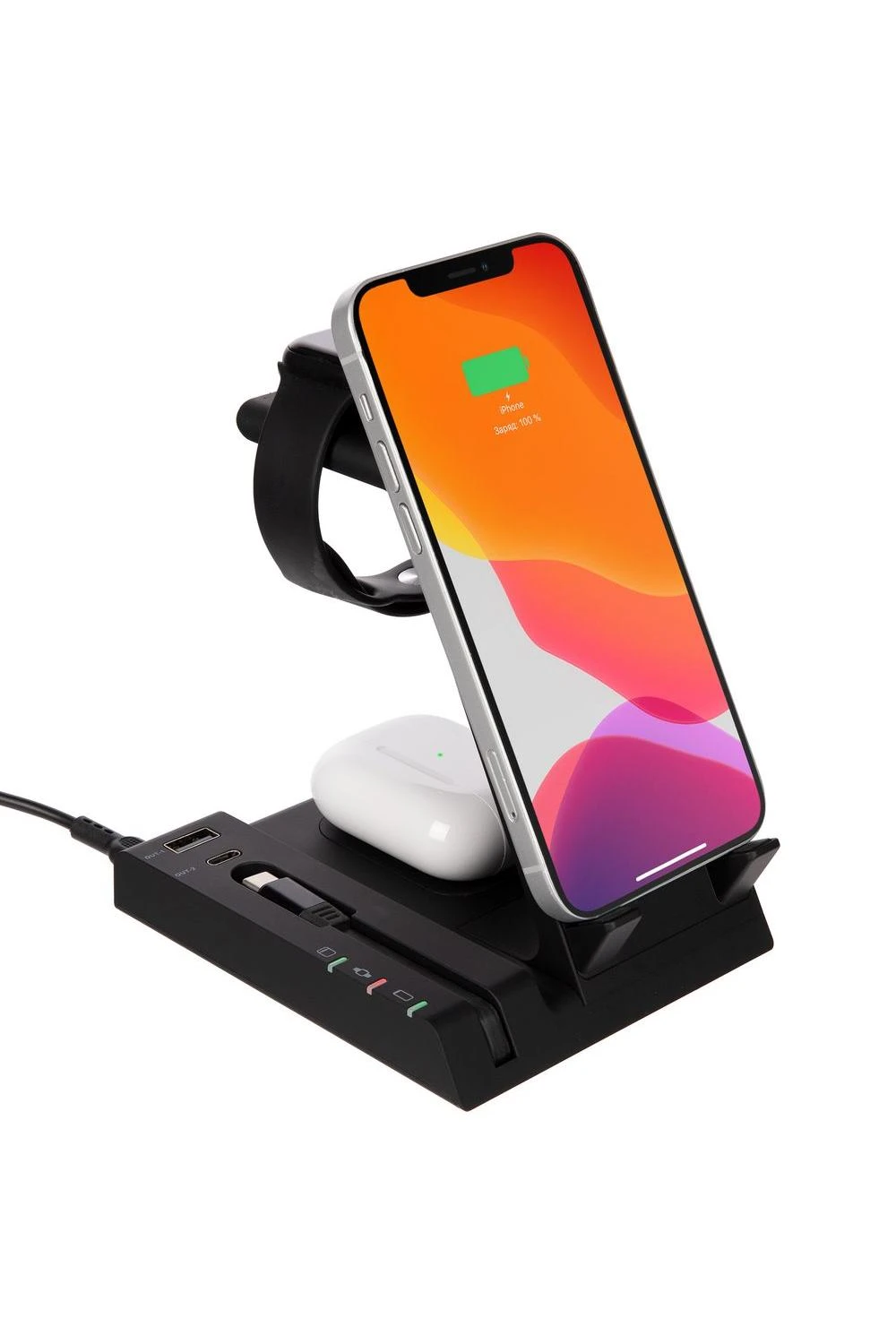 Зарядная станция Tres — полезный подарок для любителей высоких технологий. Она позволяет заряжать до 6 гаджетов одновременно: телефон, часы и наушники с поддержкой протокола беспроводной зарядки Quick Charge и еще 3 устройства через кабели с разъемами USB-А и Type-C. Благодаря компактным размерам станция не займет много места на рабочем столе или прикроватной тумбе, а все любимые электронные помощники всегда будут под рукой.