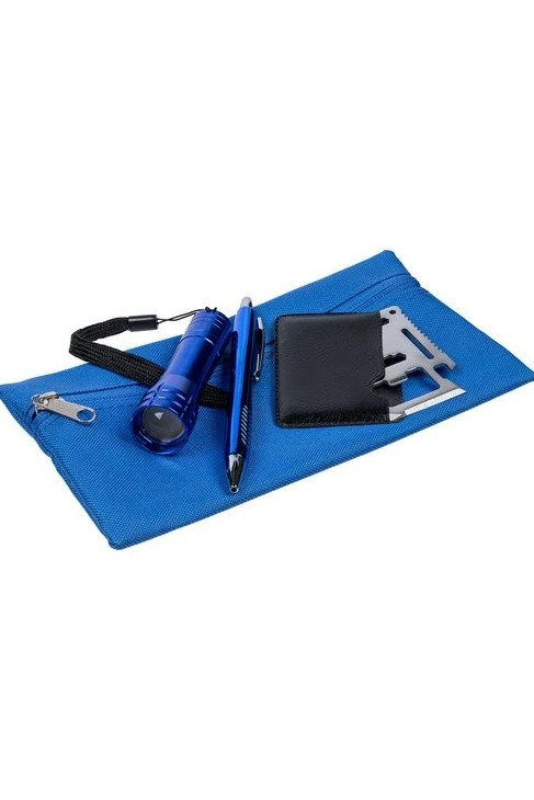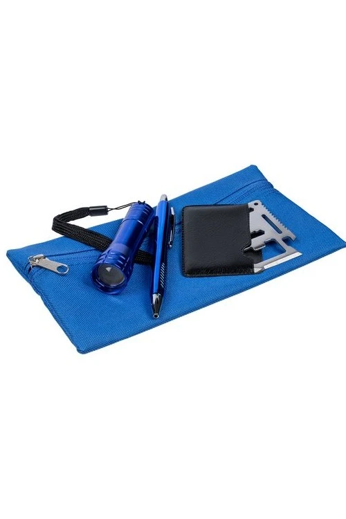 Набор состоит из алюминиевого фонарика, мультитула из нержавеющей стали и искусственной кожи, пластиковая ручка, пенал размером 22х12 см.