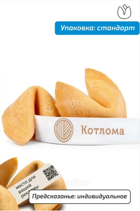 Компания «Корпорация удачи», предлагает приобрести печенье с предсказаниями оптом по невысокой стоимости. Продукция изготавливается по современным технологиям, на автоматизированном оборудовании, с использованием качественных продуктов. Оригинальный подарок в виде десерта с запиской поднимет настроение и принесет положительные эмоции.