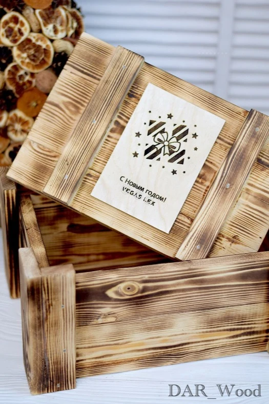 Деревянный ящик с крышкой, которая накладывается сверху, для корпоративного новогоднего подарка. Ящик забрендирован деревянным шильдом с вашим изображением.
