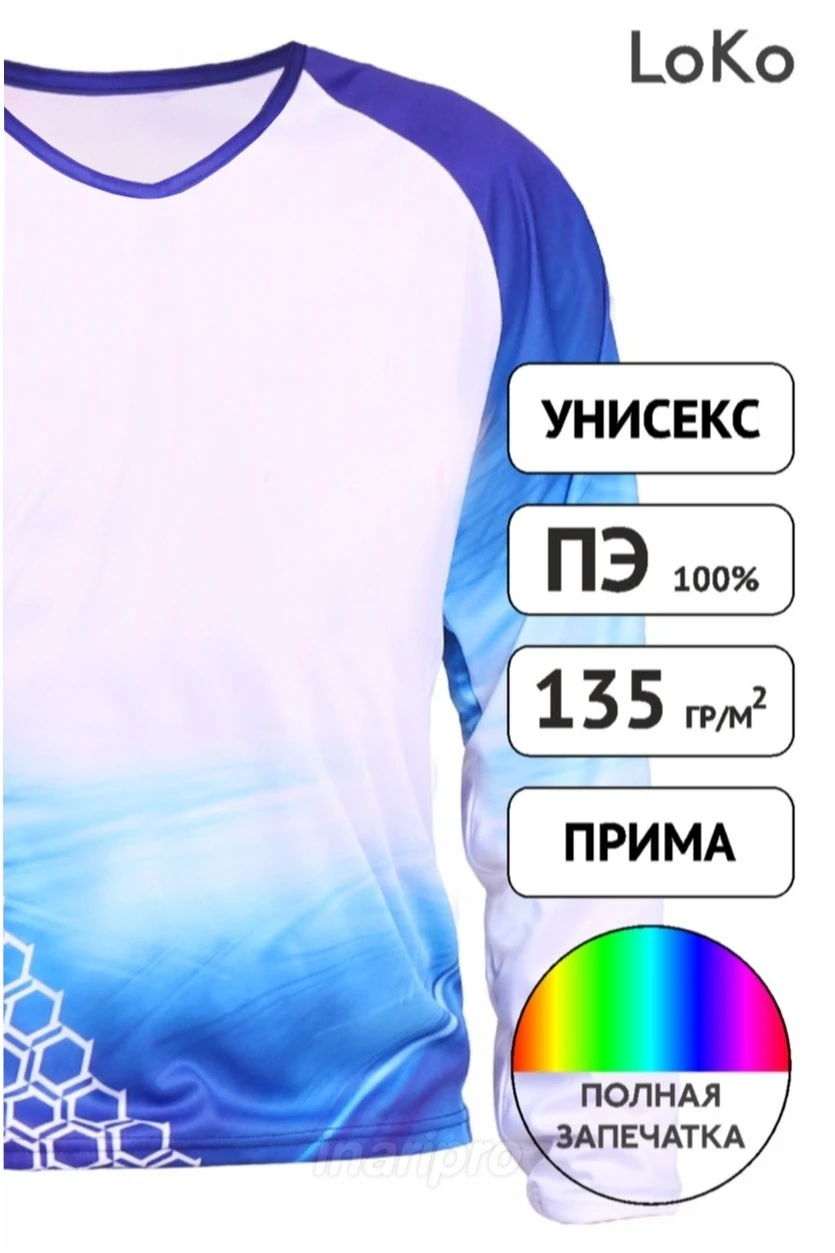 Сублимация. Полноцветная печать осуществляется на всей поверхности логслива в процессе производства. Изображение располагается в соответствии с лекалом. Нанесение входит в стоимость лонгслива. Совмещение изображения на швах осуществляется за дополнительную плату.