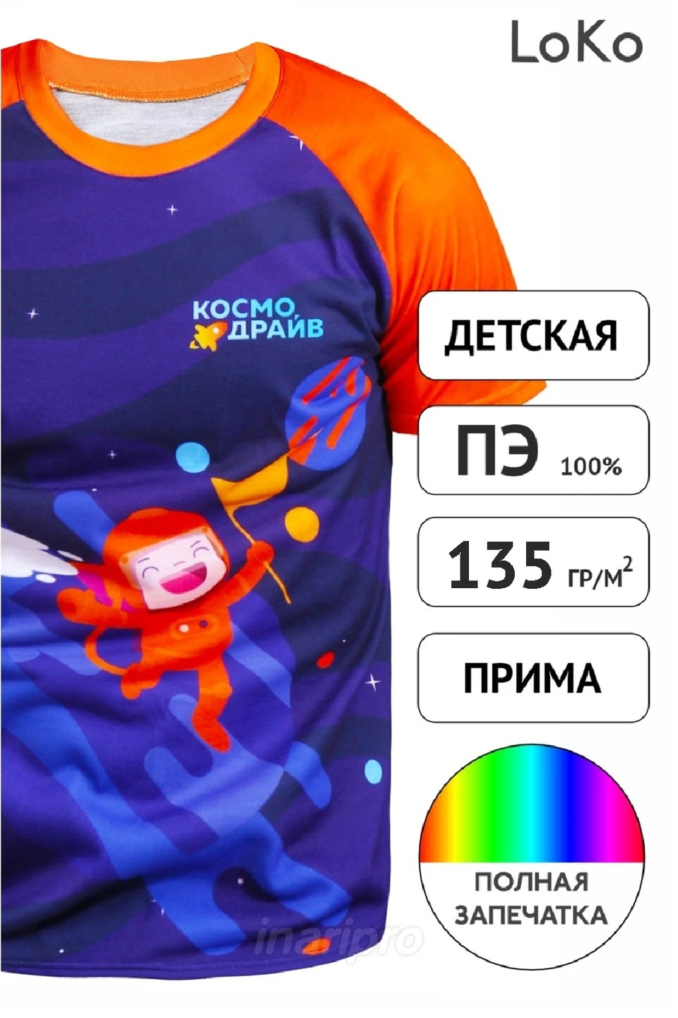 Цветовая палитра дизайна футболки "Космо Драйв" завоюет сердца ваших детей, если они увлечены тематикой космоса и космических мультфильмов, а также если они просто любят сочетание оранжевого и синего.