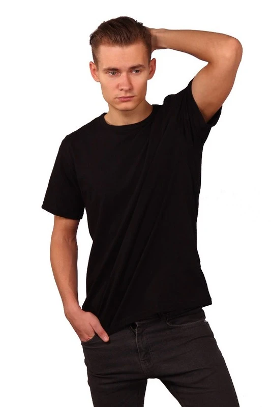 Модель. Прямой силуэт. Рукав короткий. Футболка имеет боковые швы без разрезов по низу изделия. Обработка горловины руликом (кантом) из основной ткани. Форма ворота О-образная.