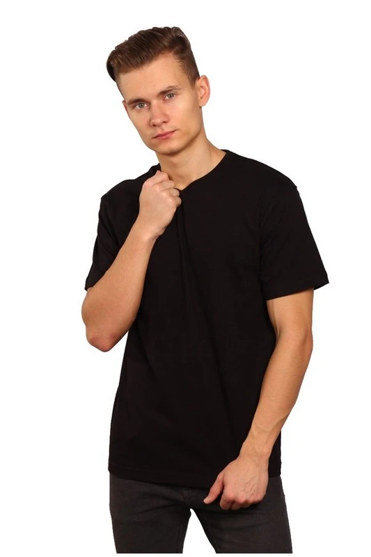 Модель. Прямой силуэт. Рукав короткий. Без боковых швов и разрезов по низу изделия. Обработка горловины эластичной рибаной (специальная тканая резинка) в цвет футболки. Форма ворота О-образная.
