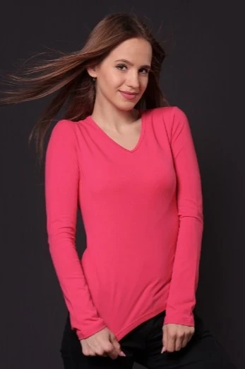 Модель. Приталенный силуэт. Рукав длинный. Лонгслив имеет боковые швы без разрезов по низу изделия. Обработка горловины руликом (кантом) из основной ткани в цвет лонгслива или другого цвета. Форма ворота О или V-образная. Возможно бесплатное комбинирование деталей разных цветов (например, рукава могут отличаться по цвету от остальных деталей).