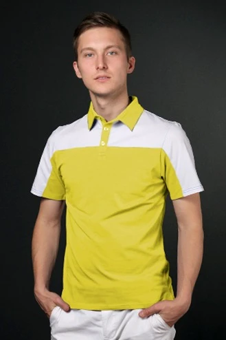 Модель. Прямой силуэт за счет ткани стрейч облегает фигуру. Рукав короткий. Боковые разрезы по низу изделия. Планка на три пуговицы, воротник стойка из основной ткани. Применяются стандартные цвета пуговиц. Футболка состоит из двух сшивных деталей на полочке, спинке и рукавах, за счет чего есть возможность комбинировать цвета на усмотрение клиента.