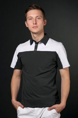 Модель. Прямой силуэт за счет ткани стрейч облегает фигуру. Рукав короткий. Боковые разрезы по низу изделия. Планка на три пуговицы, воротник стойка из основной ткани. Применяются стандартные цвета пуговиц. Футболка состоит из двух сшивных деталей на полочке, спинке и рукавах, за счет чего есть возможность комбинировать цвета на усмотрение клиента.