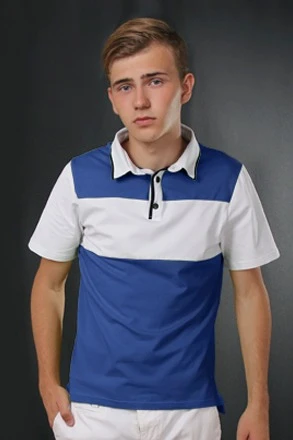 Модель. Прямой силуэт, за счет ткани стрейч облегает фигуру. Рукав короткий. Боковые разрезы по низу изделия. Планка на три пуговицы, воротник стойка из основной ткани. Применяются стандартные цвета пуговиц. На полочке футболки декоративная вставка, за счет чего есть возможность комбинировать цвета на усмотрение клиента. Край воротника и планки окантован контрастным цветом.