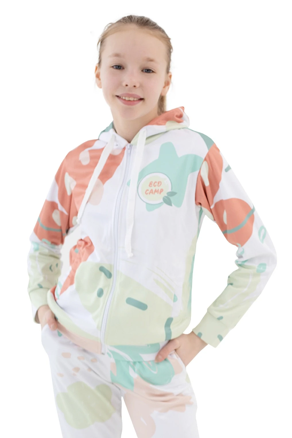 Модель. Прямой силуэт, балахон на молнии. Длинные рукава. Низ балахона и манжеты рукавов выполнены из сублимационной ткани сандвич браш. Два раздельных накладных кармана по типу кенгуру. Капюшон пришивной двухслойный, внутренний слой из однотонной кулирной глади с лайкрой стандартных цветов на выбор. Но рекомендуется выбрать кулирную гладь цвета меланж, универсален под любой дизайн. У края капюшона продет плоский шнур стандартных цветов.