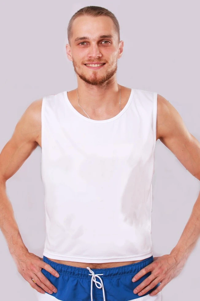 Модель. Прямой силуэт. Пройма рукавов и горловины обработаны руликом (кант из основной ткани). Майки имеют укороченную длину.