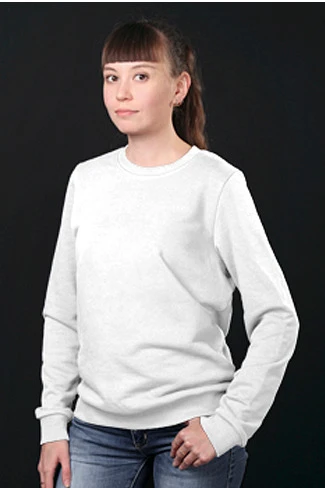 Модель. Прямой силуэт. Толстовка без молнии. Длинные рукава. Низ толстовки и рукавов, а также горловина обработаны тканью кашкорсе (специальная тканная резинка) в цвет толстовки. Толстовка без капюшона и карманов.