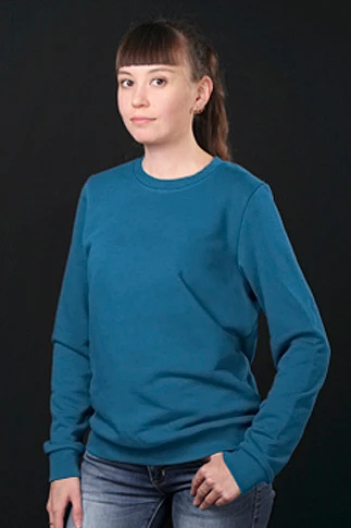 Модель. Прямой силуэт. Толстовка без молнии. Длинные рукава. Низ толстовки и рукавов, а также горловина обработаны тканью кашкорсе (специальная тканная резинка) в цвет толстовки. Толстовка без капюшона и карманов.