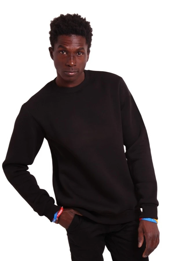 Модель. Прямой силуэт. Толстовка без молнии. Длинные рукава. Низ толстовки и рукавов, а также горловина обработаны тканью кашкорсе (специальная тканная резинка) в цвет толстовки. Толстовка без капюшона и карманов.
