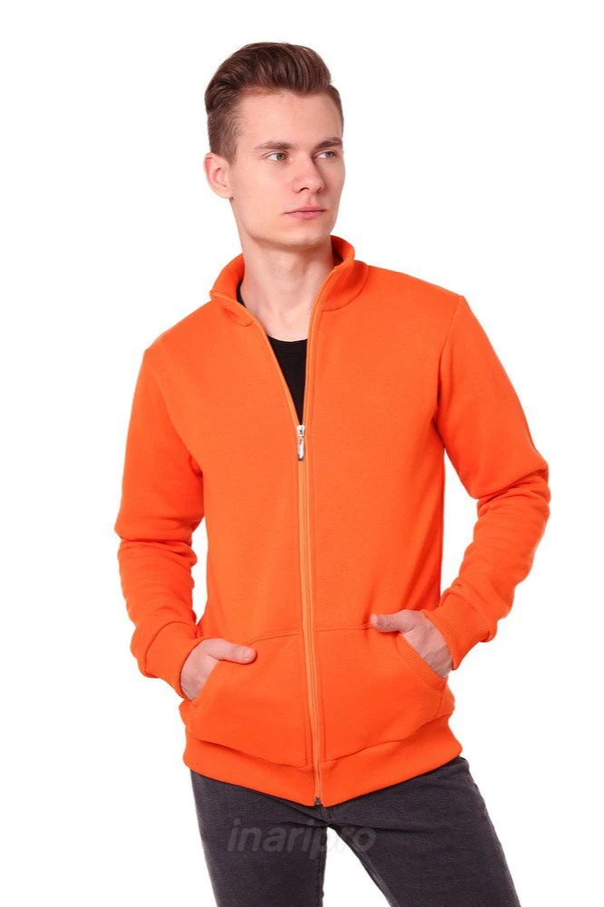 Модель. Прямой силуэт. Толстовка на молнии. Длинные рукава. Низ толстовки и рукавов, а также горловина обработаны тканью кашкорсе (специальная тканая резинка) в цвет толстовки. Толстовка без капюшона. Два раздельных кармана по типу кенгуру.