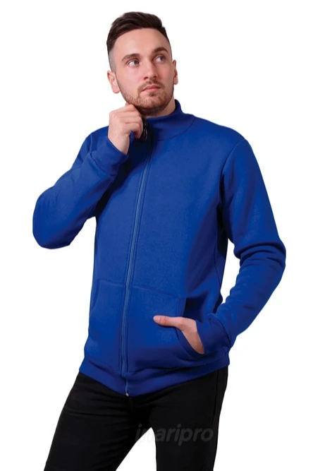 Модель. Прямой силуэт. Толстовка на молнии. Длинные рукава. Низ толстовки и рукавов, а также горловина обработаны тканью кашкорсе (специальная тканая резинка) в цвет толстовки. Толстовка без капюшона. Два раздельных кармана по типу кенгуру.