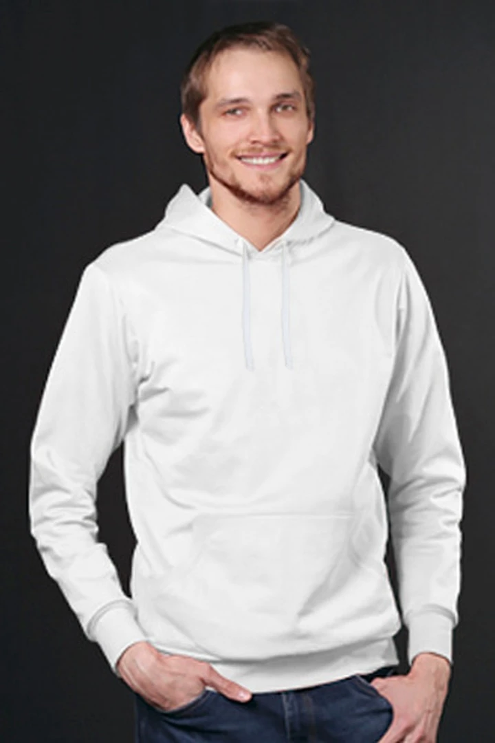 Модель. Прямой силуэт. Толстовка без молнии. Длинные рукава. Низ толстовки и рукавов обработаны тканью кашкорсе (специальная тканая резинка) в цвет толстовки. Один общий карман по типу кенгуру. Капюшон пришивной двухслойный, внутренний слой из однотонной кулирной глади с лайкрой стандартных цветов на выбор. У края капюшона продет плоский шнур шириной 15 мм стандартных цветов.
