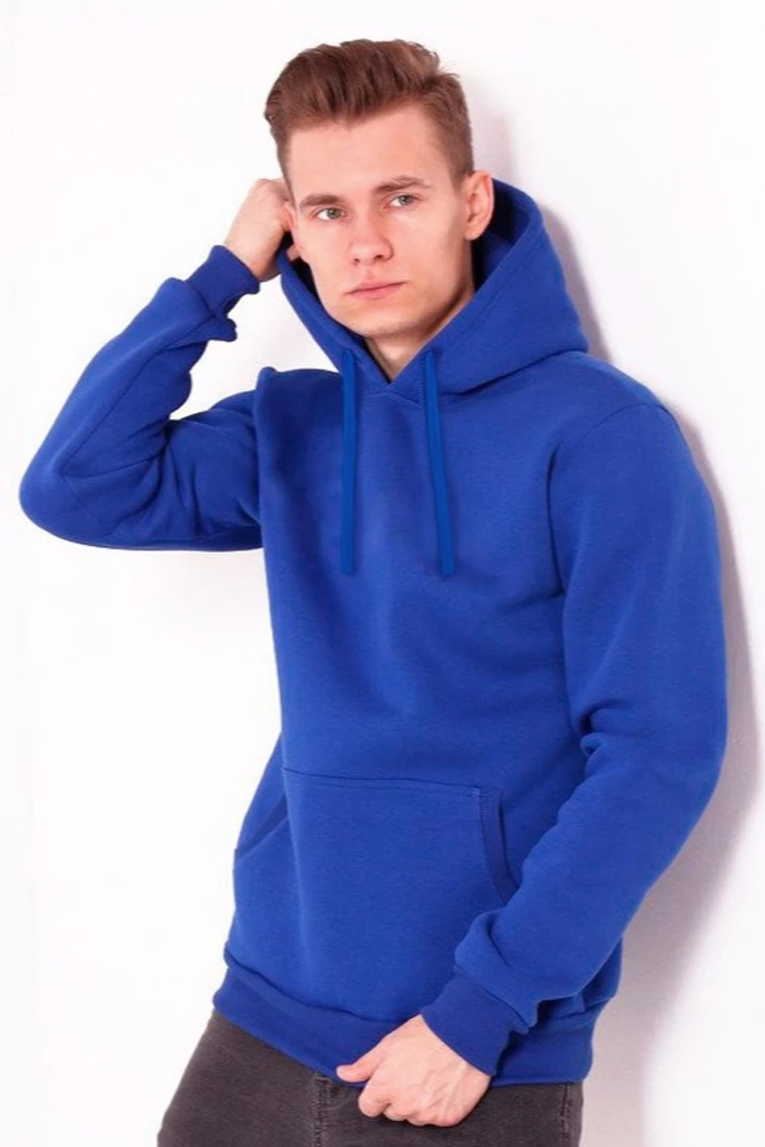 Модель. Прямой силуэт. Толстовка без молнии. Длинные рукава. Низ толстовки и рукавов обработаны тканью кашкорсе (специальная тканая резинка) в цвет толстовки. Один общий карман по типу кенгуру. Капюшон пришивной двухслойный, внутренний слой из однотонной кулирной глади с лайкрой стандартных цветов на выбор. У края капюшона продет плоский шнур шириной 15 мм стандартных цветов.