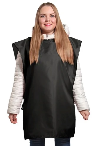 Модель: Накидка прямоугольной формы без карманов. По желанию клиента накидка может быть пошита с одним карманом 20х25 см, либо двумя карманами 13х16 см (оплачивается дополнительно). Края и горловина накидки обрабатываются косой бейкой, завязки выполнены из косой бейки длиной 30 см. Возможна обработка края накидки швом вподгибку, горловина обрабатывается косой бейкой, завязки выполнены из брючной ленты белого или черного цветов, длиной 30 см. За дополнительную плату крепление может быть изготовлено из резинки (ширина 2,5 см), либо липы, либо завязок из брючной ленты белого или черного цветов с креплением "межуровневый замок".