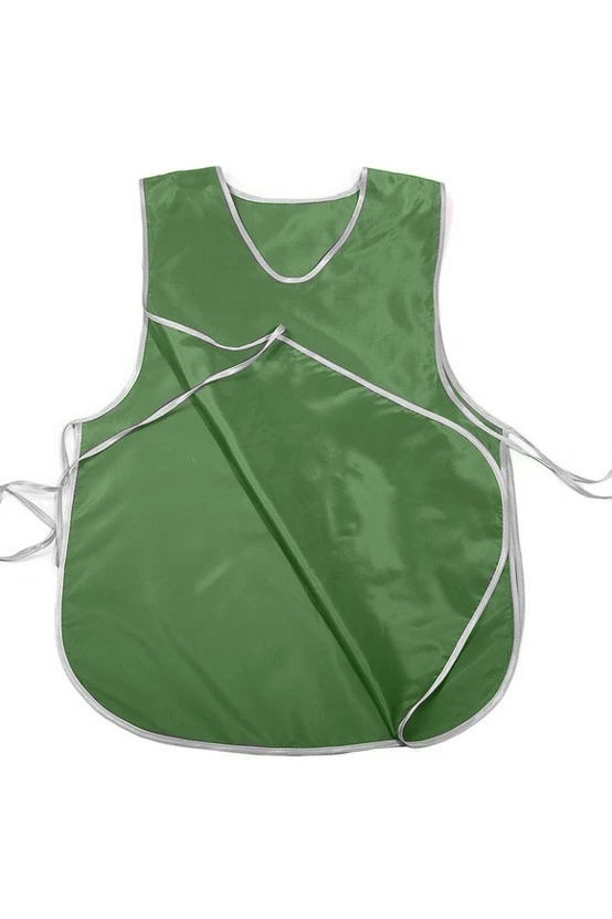 Модель: Накидка фигурной формы без карманов. За дополнительную плату фартук-накидка может быть пошит с одним карманом 20х25 см, либо двумя карманами 13х16 см. Края и горловина фартука обрабатываются косой бейкой стандартных цветов. Завязки длиной 50 см, выполнены из косой бейки.