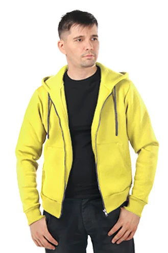 Модель. Прямой силуэт. Балахон на молнии. Длинные рукава. По низу толстовки и рукавов прошита специальная тканная резинка кашкорсе в цвет толстовки. Два раздельных кармана по типу кенгуру. Капюшон пришивной двухслойный, внутренний слой из однотонной кулирной глади с лайкрой стандартных цветов на выбор. У края капюшона продет плоский шнур шириной 15 мм стандартных цветов.